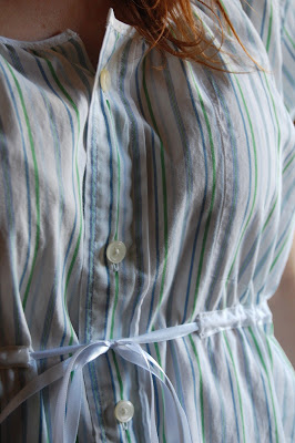 Then I added a strip of bias tape around the bust line (I accidentally put it about an inch too low, but I'm too lazy to fix it) and strung some white ribbon through, per Megan's tutorial.
